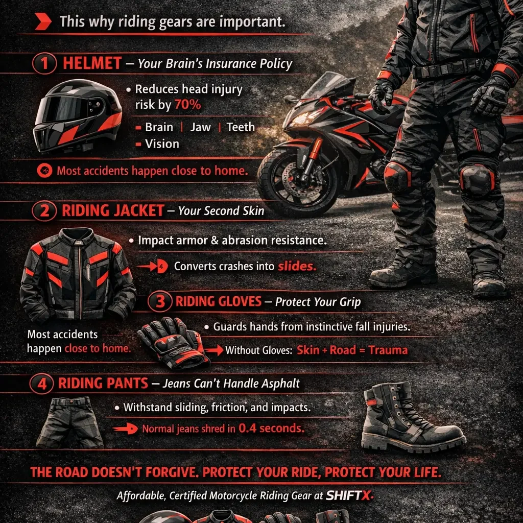 Why Riding Gears Are Important for Every Biker by ShiftX Why Riding Gears Are ImportantMotorcycling is freedom on two wheels.Wind in your face, engine humming, road unfolding like a story. But here’s the uncomfortable truth most riders learn too late:The road is not forgiving. That’s why riding gears are important — not as accessories, not as fashion, but as life-saving equipment designed using physics, engineering, and real crash science. At ShiftX, we believe great riding starts with great protection. Riding Gear Is Your Personal Safety System Every crash has three enemies: Impact – when your body hits something solidAbrasion – when your body slides on the roadWeather & fatigue – when heat, rain, and cold slow your reactions Motorcycle riding gear fights all three. A certified helmet absorbs impact energy.A riding jacket and pants prevent skin loss.Gloves protect your hands from instinctive fall injuries.Boots stabilize your ankles from twisting forces. This is not marketing.This is applied science. Why Riding Gear Is Important Even for Short Rides Most accidents happen close to home. Not because home is dangerous —but because riders relax their discipline. “No helmet, bas 2 minute ka ride.”“No gloves, sirf petrol lene ja raha hoon.” Physics doesn’t care. A fall at 40 km/h is the same fall whether you’re riding 2 km or 200 km. Motorcycle safety gear works all the time, or it works none of the time. The 5 Essential Motorcycle Riding Gears 1. Helmet – Your Brain’s Insurance Policy Your brain cannot be repaired. A full-face certified helmet reduces the risk of fatal head injury by nearly 70%. It protects: No helmet means gambling with your future. 2. Riding Jacket – Your Second Skin A proper motorcycle jacket includes: It turns a violent crash into a survivable slide. 3. Riding Gloves – Protection Where You Need It Most In a fall, hands go first. Good riding gloves provide: They protect your control and your confidence. 4. Riding Pants – Because Normal Jeans Fail Regular jeans tear in seconds. Motorcycle riding pants survive long enough to save your skin. That difference decides whether you walk away or not. 5. Riding Boots – The Foundation of Safety Ankles break easily. Riding boots prevent: Walking home starts with your feet. Why Riding Gears Are Important in Indian Conditions Indian roads are unpredictable: Motorcycle riding gear is not optional here.It is essential. Modern gear is lightweight, ventilated, and built for Indian weather — comfort is no longer an excuse. Riding Gear Makes You a Better Rider Protection changes psychology. When you feel safe, you ride better: Fear shrinks skill.Protection expands it. Final Thought from ShiftX We don’t sell riding gear. We sell the ability to ride tomorrow. That’s why riding gears are important. Because your life is more valuable than a shortcut. Ride protected.Ride longer.Ride with ShiftX.